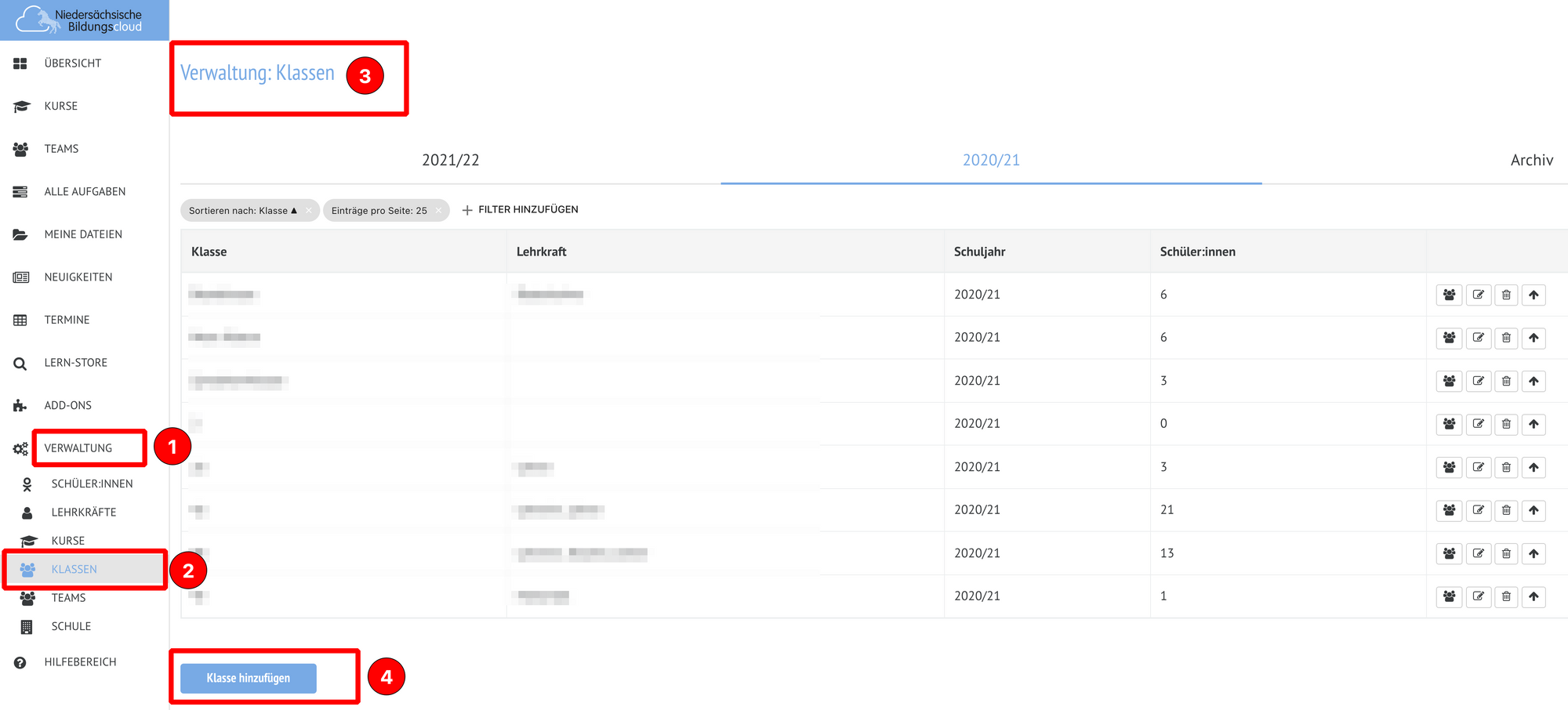 1. Klicken Sie auf den Menüpunkt Verwaltung. Dort finden Sie den Unterpunkt Klassen und gelangen so auf die Klassenübersicht. Hier können Sie nun durch einen Klick auf die Schaltfläche Klasse hinzufügen eine neue Klasse anlegen.