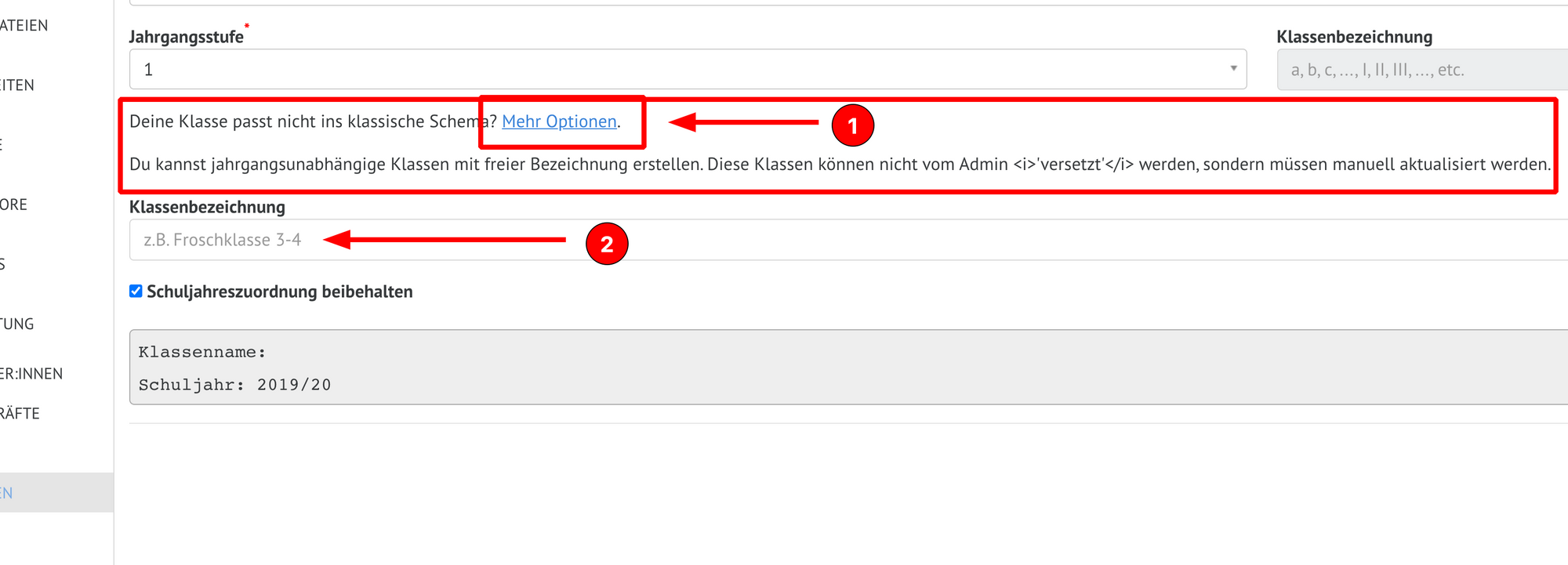2. Neben Schuljahr, Klassenlehrer:in und Jahrgang können Sie hier alle relevanten Daten eintragen. Sollten Sie weitere Optionen benötigen, klicken Sie einfach auf Mehr Optionen.