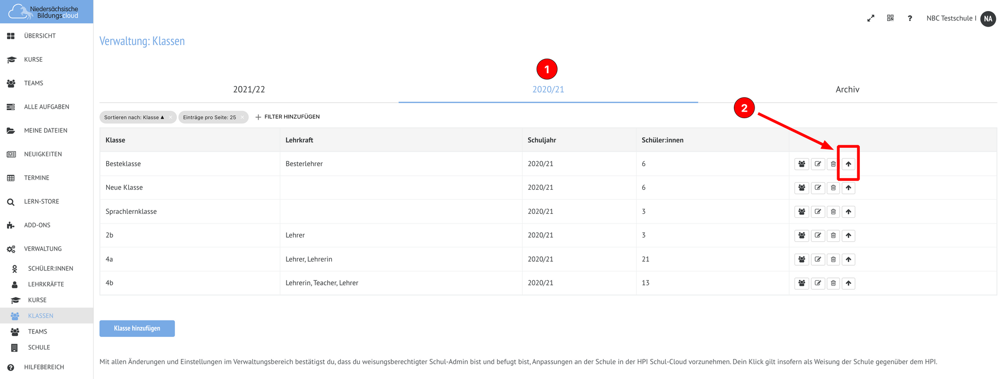 Sie benötigen ein administratives Konto um in den Bereich Verwaltung "Klassen verwalten" aufzurufen. Wenn sie im alten Jahrgang (Pkt.1) sind, können Sie bei jeder Klasse in der Liste ein Pfeil- Symbol erkennen (Pkt.2)