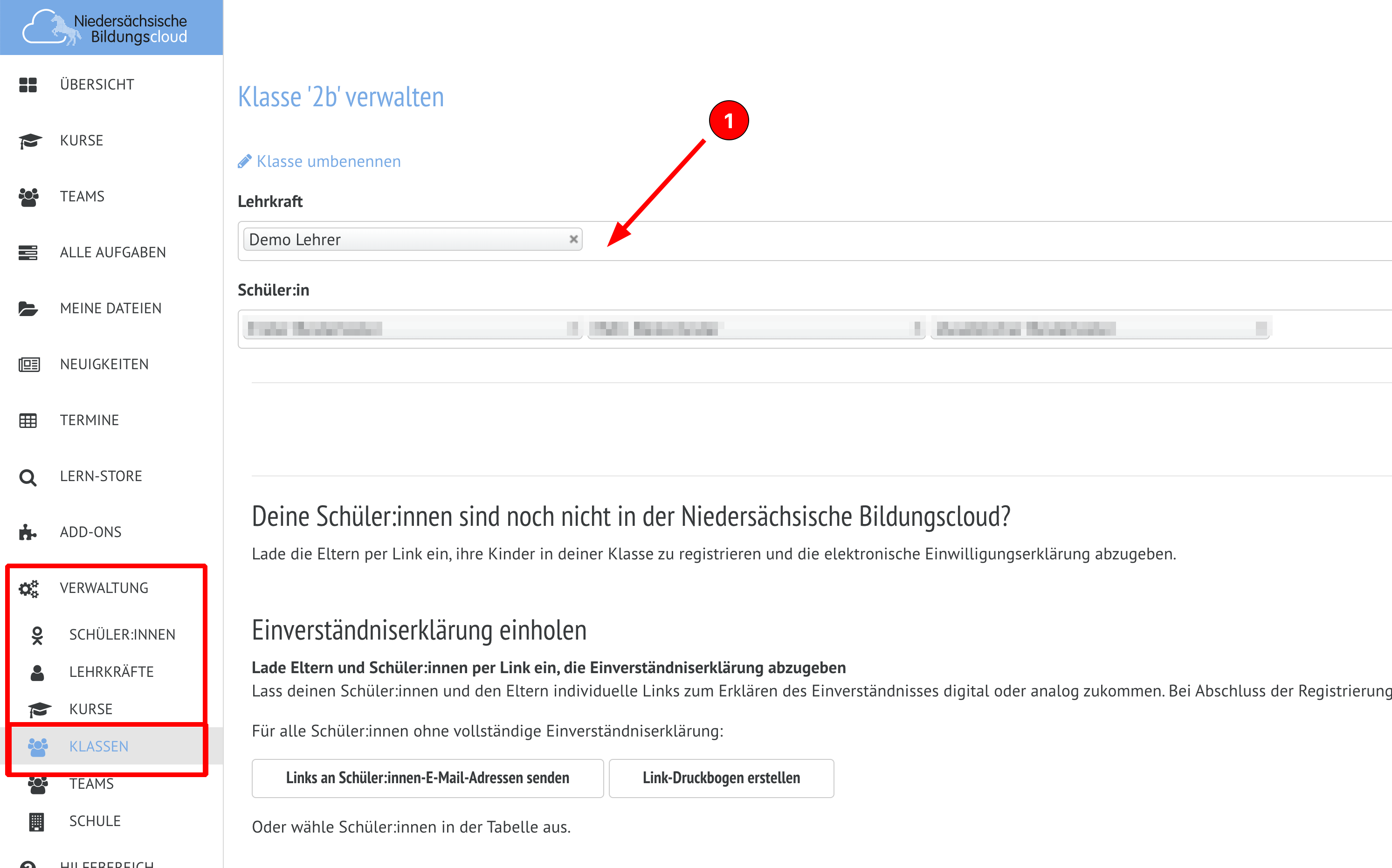 Als Zweites haben Sie die Möglichkeit über Verwaltung und dann Klassen verwalten die Merkmale der jeweiligen Klasse in dem richtigen Jahrgang anzupassen.
