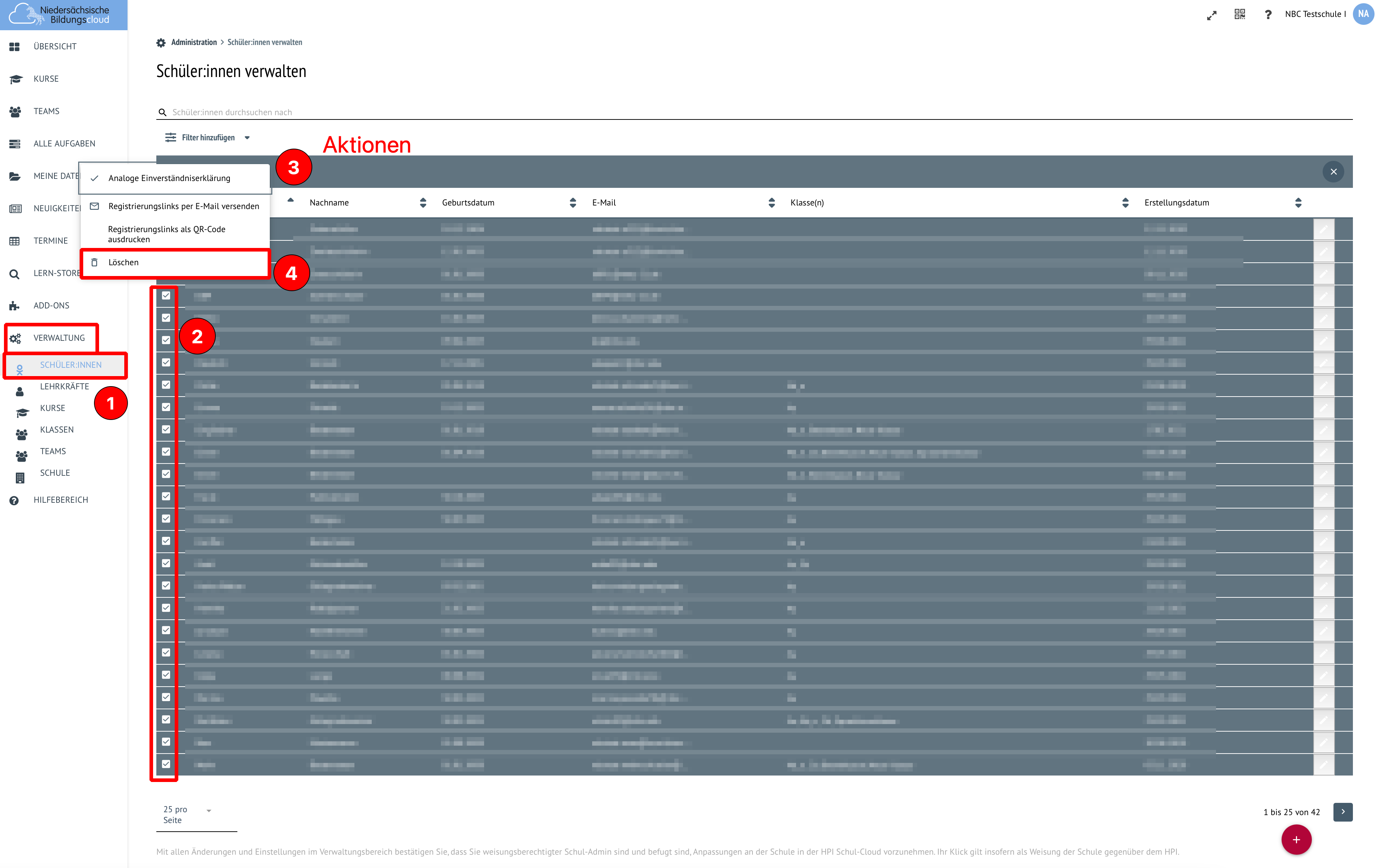 Mit einem administrativen Konto angemeldet in der Niedersächsischen Bildungscloud rufen Sie den Bereich Verwaltung auf. Dort wechseln Sie in den Bereich Schüler*innen verwalten. Sie filtern nach der Klasse im Archiv und bekommen eine Liste der Schüler*innen der betreffenden Klasse. Sie markieren die Konten links im Kästchen entweder einzeln oder oben als Gruppe und dann wählen Sie als Aktion Löschen aus.
