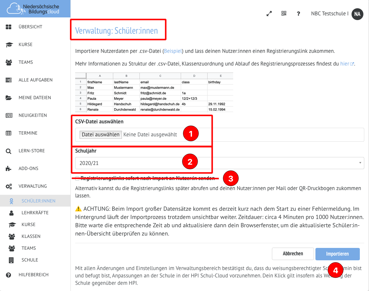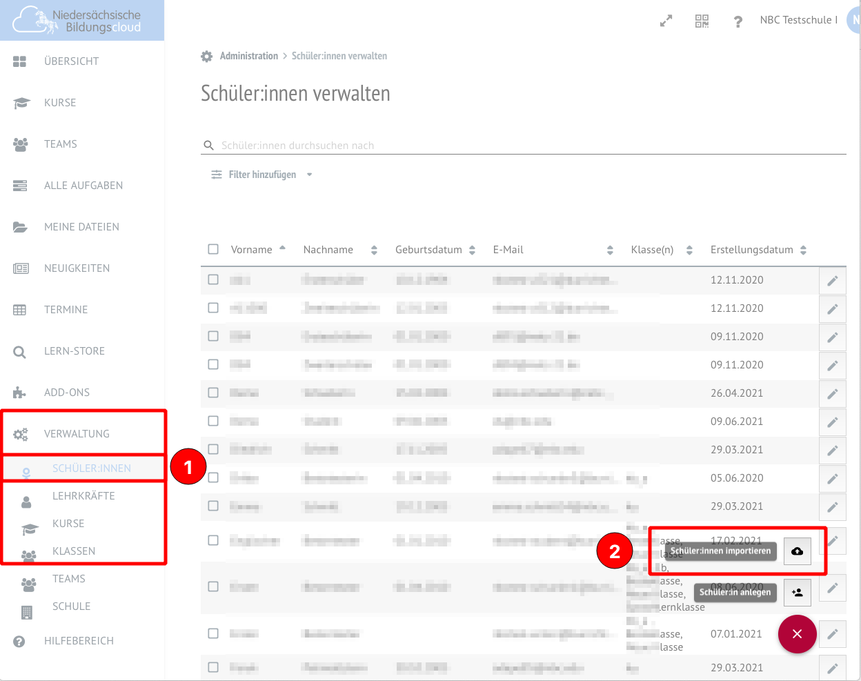 Mit einem administrativen NBC Nutzer-Konto melden Sie sich in der NBC an. Ihr Weg führt Sie über die Verwaltung in den Bereich Schüler:innen verwalten.