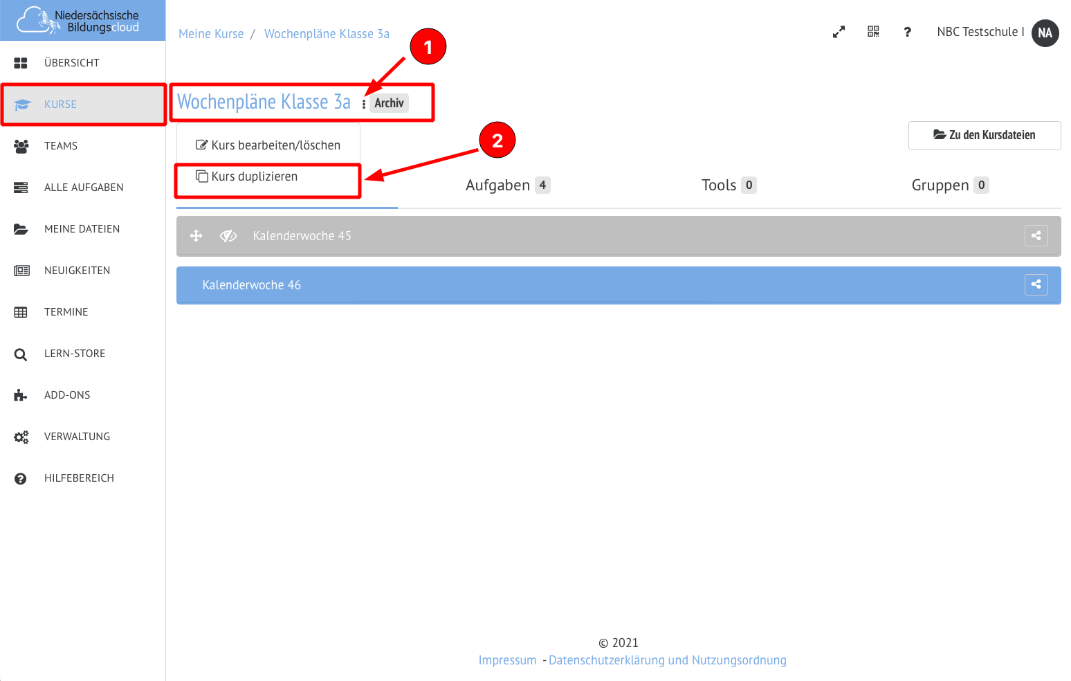 Sie haben zur Zeit auch die Möglichkeit den Kurs zu duplizieren. Dann bleibt der Kurs und die Zuordnung der Schüler:innen bestehen und die Schüler:innen der versetzten Klasse können auf den Kurs vom vergangen Schuljahr zugreifen. Allerdings ist die Funktion noch im Entwicklerstatus (sozusagen Beta Status). Bitte prüfen Sie beim Duplizieren des Kurses sorgfältig den duplizierten Kurs auf Zugriff und Vollständigkeit der Dateien. Sie sollten den Zugriff auch mit einem Schüler:innen-Konto prüfen!