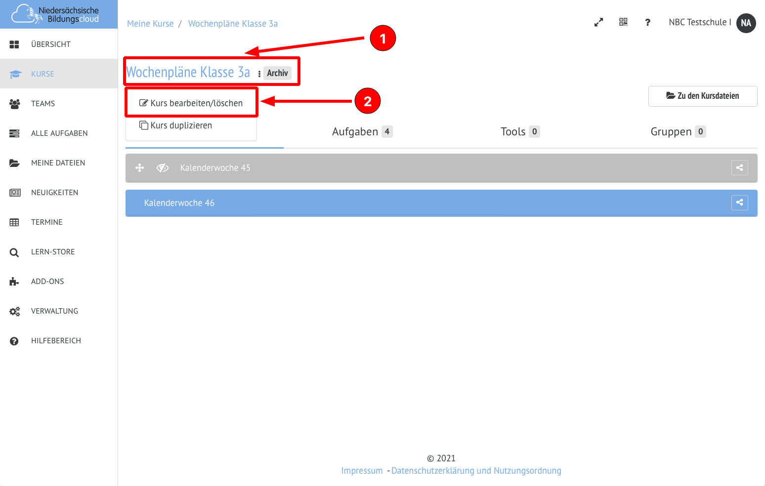 Die Kurse müssen (egal ob der vorige oder der duplizierte Kurs) für das aktuelle Jahr angepasst werden. Dazu öffnen Sie den Kurs im Bereich "Archivierte Kurse", öffnen den betreffenden Kurs, klicken auf den Kursnamen oder die 3 Punkte (Pkt. 1) und wählen "Kurs bearbeiten/löschen" (Pkt.2) aus. Keine Panik, wir löschen nicht sondern bearbeiten nur.