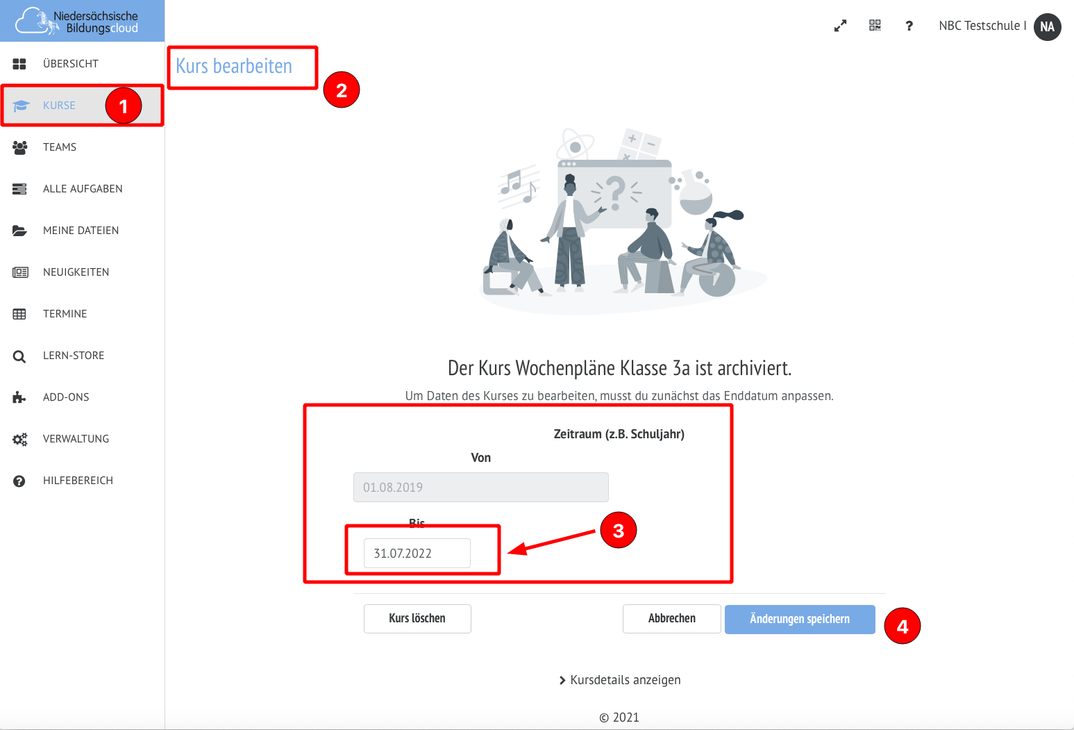 Jetzt muss der Kurs aus dem Archiv verschoben werden, indem der Kurs ein neues END-Datum von Ihnen bekommt (Pkt.3).