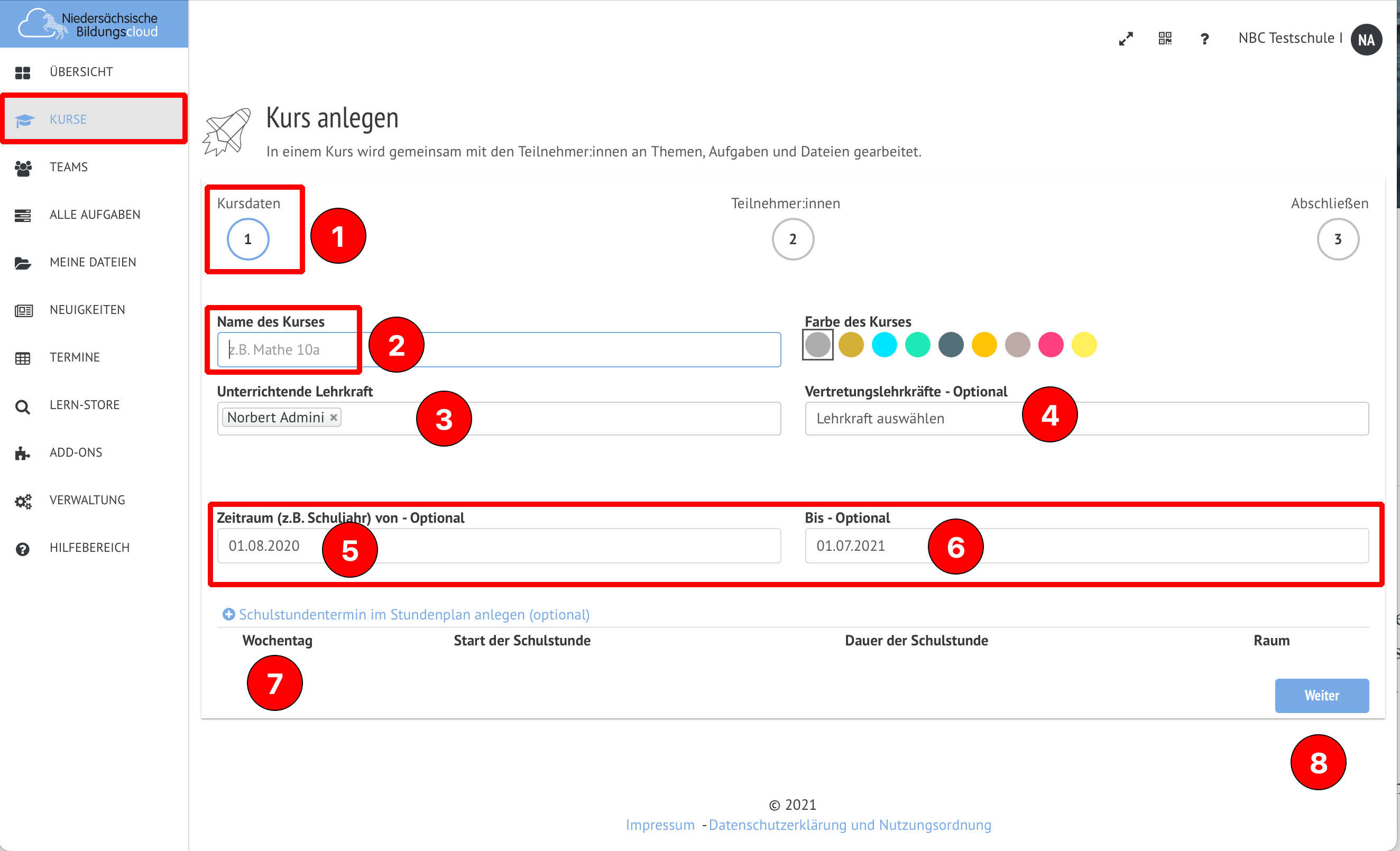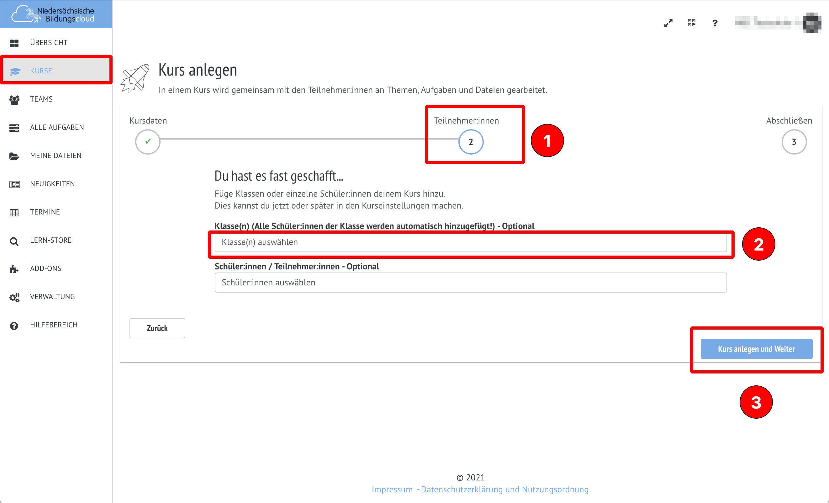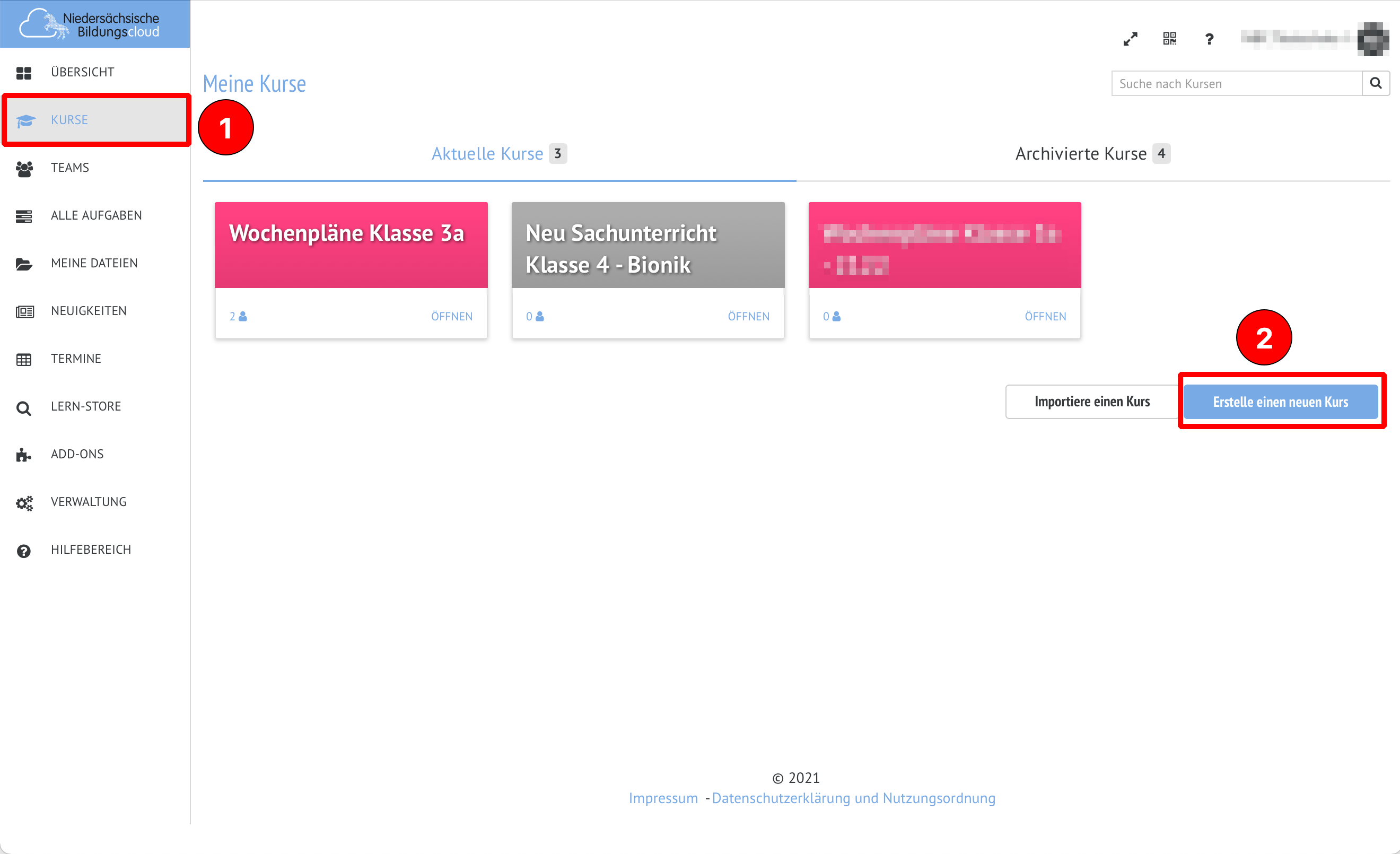 Schritt 1: Sie öffnen den Bereich Kurse in der Niedersächsischen Bildungscloud (Pkt. 1)