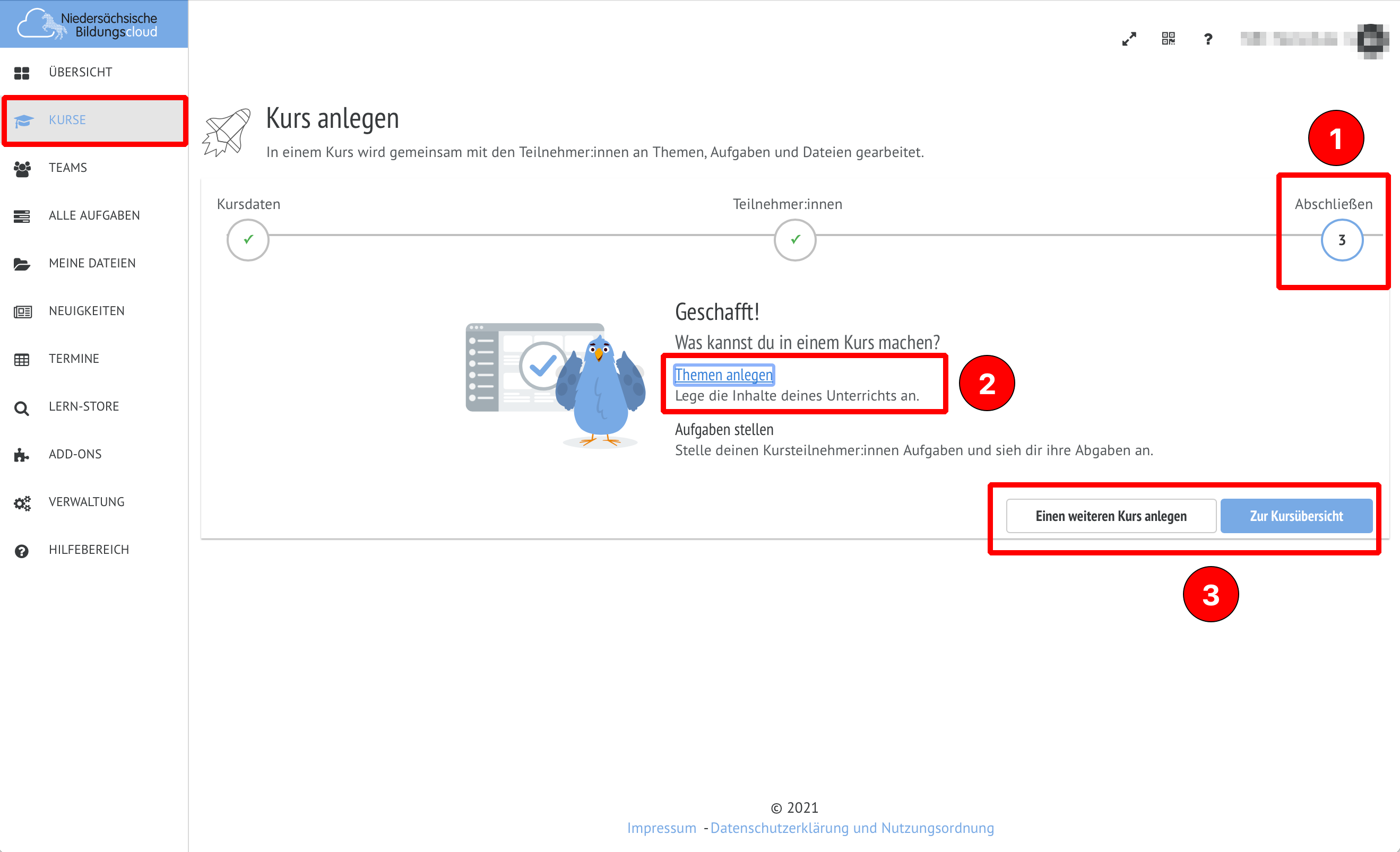 Mit Klick auf die Schaltflache "Kurs anlegen und Weiter" kommen wir in den letzten Bereich. Nun könnten Sie Themen in dem neuen Kurs anlegen (Pkt.2) oder auch zur Anlage eines weiteren Kurses springen (Pkt.3)