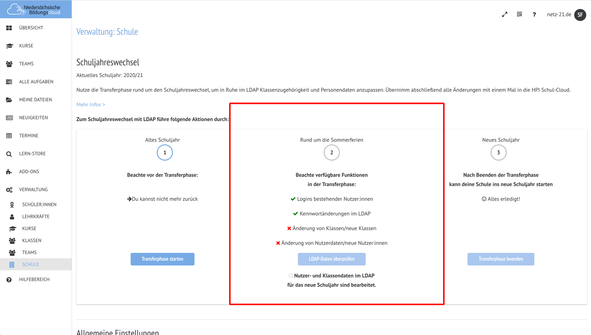 Zurück in der Übersicht zum Schuljahreswechsel. Innerhalb der Niedersächsischen Bildungscloud kann nun über den Button "LDAP-Daten überprüfen" stichprobenartig geprüft werden, ob die Daten korrekt aus dem LDAP übernommen wurden. Hierzu wird eine Übersicht der geänderten Daten mit den speziellen Details aus dem LDAP-System angezeigt. Wenn alles korrekt ist, kann der / die Admin zurück zur Übersicht zum Schuljahreswechsel gehen. Dazu klicken Sie die Checkbox "Nutzer- Klassendaten im LDAP für das neue Schuljahr sind bearbeitet" an.