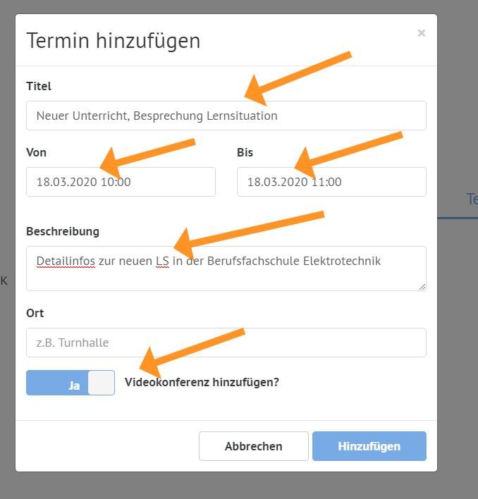 Füllen Sie die Felder zur Beschreibung aus, aktivieren Sie eine Konferenz und auf "Hinzufügen" klicken