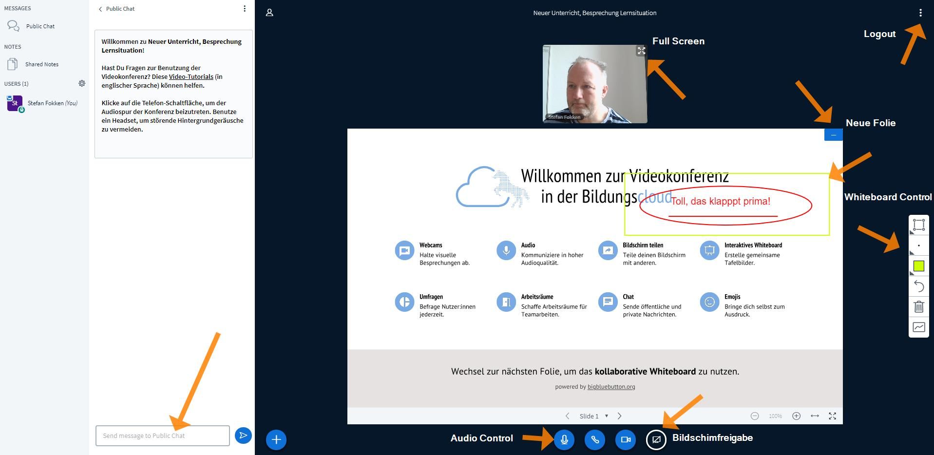 Ein Chat sowohl für die Konferenz als auch im privaten Modus, Bildschirmfreigabe, Präsentationen, Video-Freigabe (streamen) als auch Whiteboard Funktionen stehen Ihnen zur Verfügung.