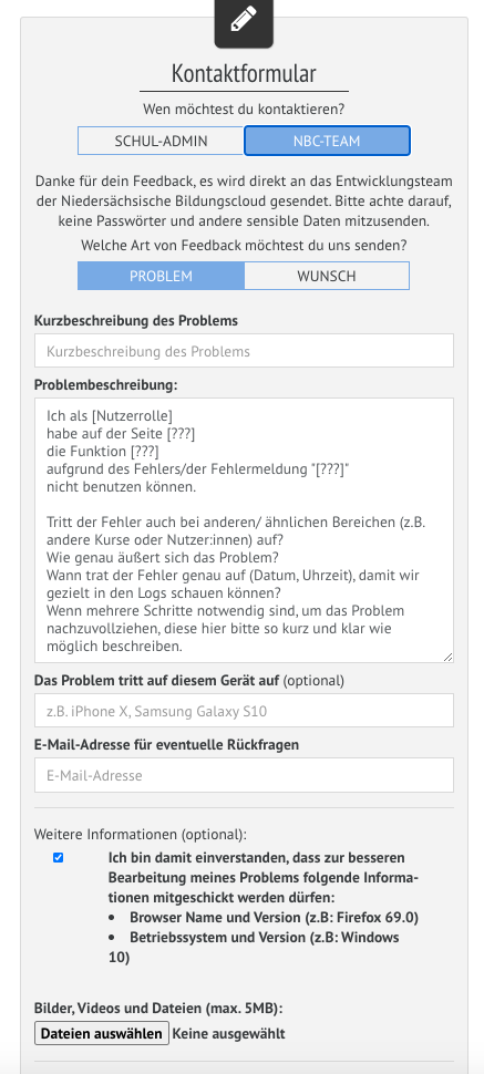 Daraufhin erhalten Sie dies Menu und können uns eine Meldung ggf. mit einer Datei zur besseren Beschreibung (Screenshot/Video,Bsp. Datei) zukommen lassen. Achten Sie dabei darauf, die Schaltfläche "NBC Team" zu aktivieren.