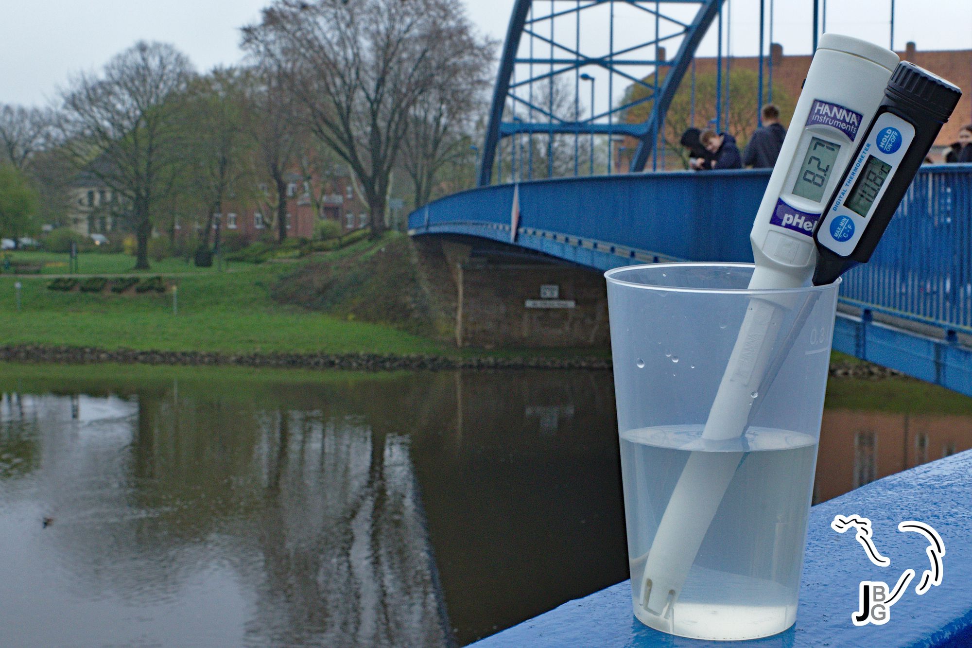 Die Wasserentnahme mithilfe eines angeseilten Kanisters hat sich als praktikabel erwiesen. Durch den Standort auf der Fahr- und Fußgängerbrücke kann problemlos Wasser auch aus der Flussmitte oder anderen Bereichen entnommen werden. Unter anderem die Fliessgeschwindigkeit, aber auch wasserchemische Parameter weichen in der Flussmitte ein wenig von denen am Flussufer ab. Das Überführen der jeweiligen Wasserproben aus dem zur Entnahme verwendeten Wasserkanister in die dafür vorgesehen Untersuchungsgefäße bewirkt möglicherweise, aber besonders bei warmer Witterung, ein Verfälschen von temperaturabhängigen Messwerten (z. B. Sauerstoffgehalt). Elektronische Tests oder Tropftests haben sich dabei als sehr effektiv erwiesen, da dadurch schnell ein Ergebnis bzw. Messwert erzielt werden kann und zudem sind diese Tests in ihrer Handhabung einfach und sicher durchzuführen.