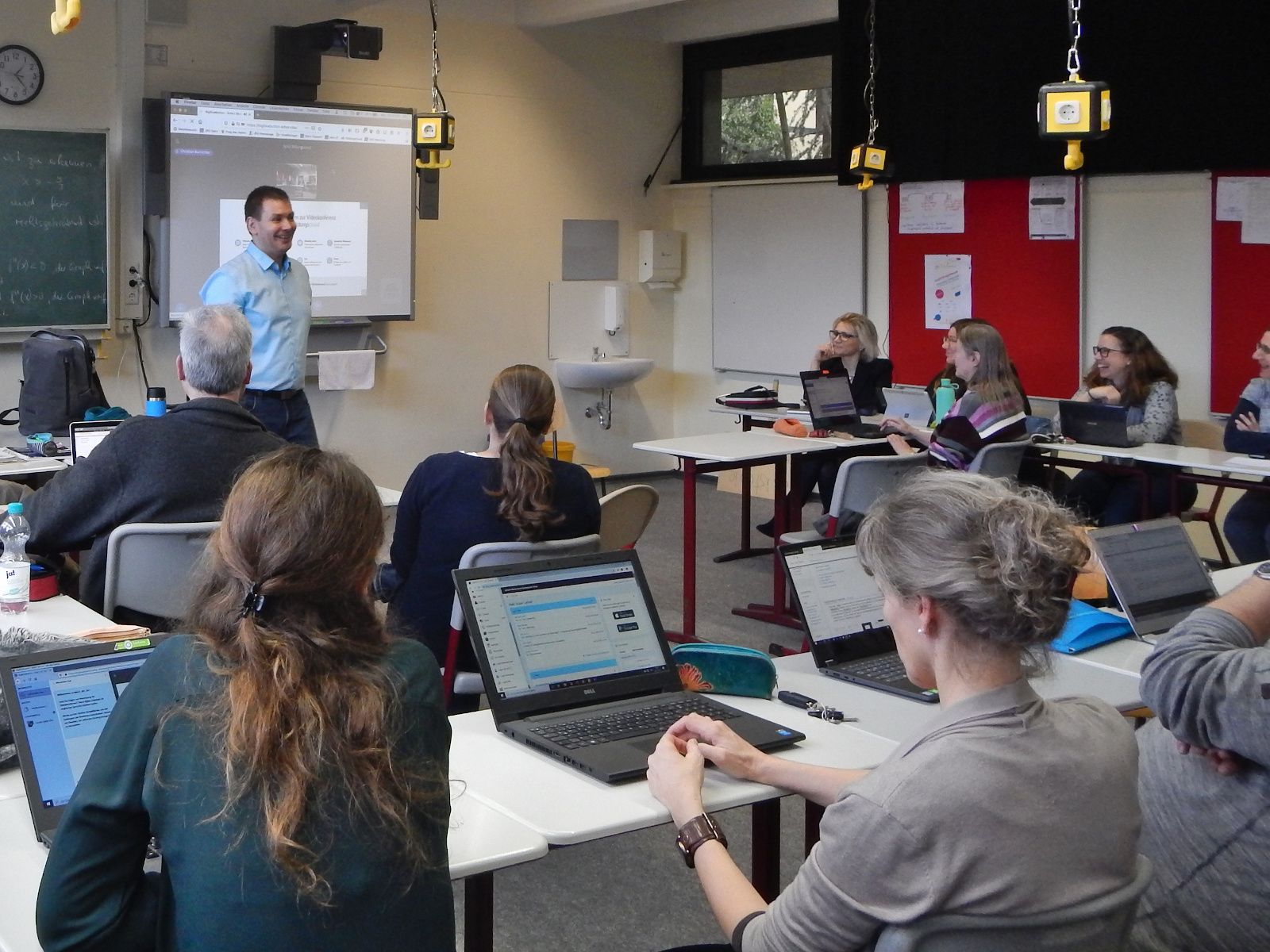 Zusätzlich zu den Informationen im Wiki hat Herr Burrichter zwei spontane, schulinterne Fortbildungen für alle Lehrkräfte organisiert. Denn schließlich betraf die angeordnete Quarantäne 90 % aller Kurse im 12. Jahrgang! Die Lehrkräfte haben daraufhin ihren Unterricht an die neue Situation angepasst und unterrichten nun zum Teil über Videokonferenzen mit den in Quarantäne befindlichen Schülerinnen und Schülern. Diese arbeiten in Gruppen mit Schülern in der Schule, die weiter ganz normal am Unterricht teilnehmen und erstellen gemeinsame Texte und Aufgaben.
