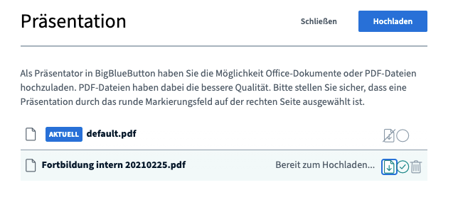In BBB kann zur Präsentation von Inhalten und Materialien ein Interaktives Board genutzt werden. Welche Formate kann ich in BBB als Präsentation hochladen? BigBlueButton akzeptiert Office Dokumente ( .doc .docx .pptx .ppt .xls .xlsx ), Text Dokumente (.txt), Bilder (.png ,.jpg) und Adobe Acrobat Dokumente (.pdf)