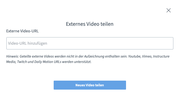 Einfacher ist es, über das "+" Zeichen in der Oberfläche der BBB die Schaltfläche "Externes Video teilen" auszuwählen.
