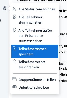 Ich brauche eine Teilnehmerliste. Wer ist in der Konferenz? Im TN Bereich auf der linken Seite ist es möglich, bei der Überschrift TN das Zahnrad anzuklicken. In dem sich dann öffnenden Fenster können Sie die Option "Teilnehmernamen speichern" auswählen. Das System erstellt Ihnen eine Textdatei mit den Daten der Konferenz und den Namen der TN nach Vor- und Nachnamen sortiert. Die Datei finden Sie im Download-Ordner Ihres Systems.