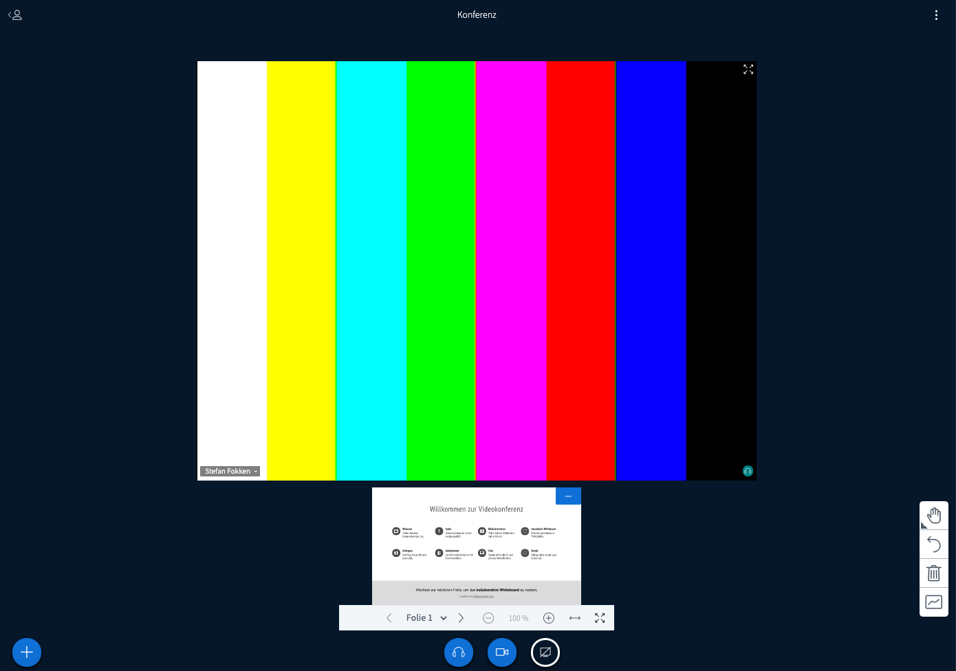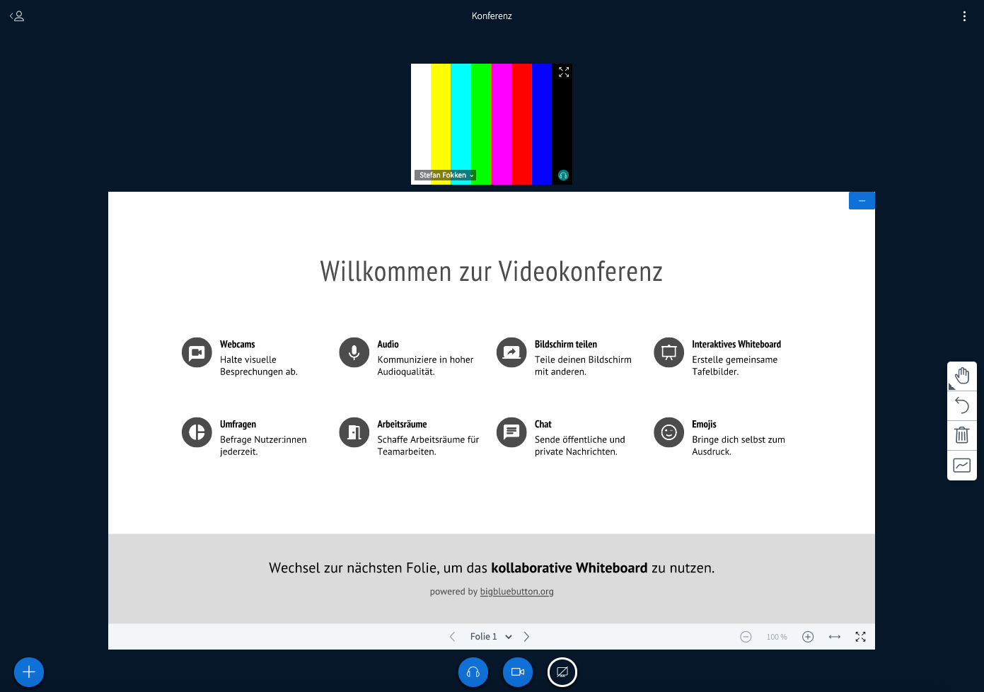 Präsentationen lassen sich in BBB problemlos so vergrößern, dass sie über den Bildschirm gut erkennbar sind. Dazu kann man das 4-fach Pfeilsymbol in dem Präsentationsfeld anklicken, um die Präsentation in Vollbild zu vergrößern. Auch die + / - Tasten können diesbezüglich genutzt werden.