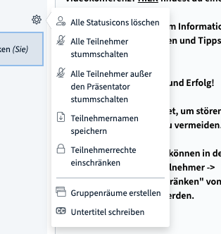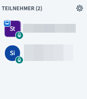 Als Moderator*in können Sie die TN stumm schalten. So verhindern sie ein Stimmengewirr, bei dem niemand richtig zuhören kann. Über das Zahnrad oder das Icon der betreffenden Teilnehmer*innen erreichen Sie die Einstellung.
