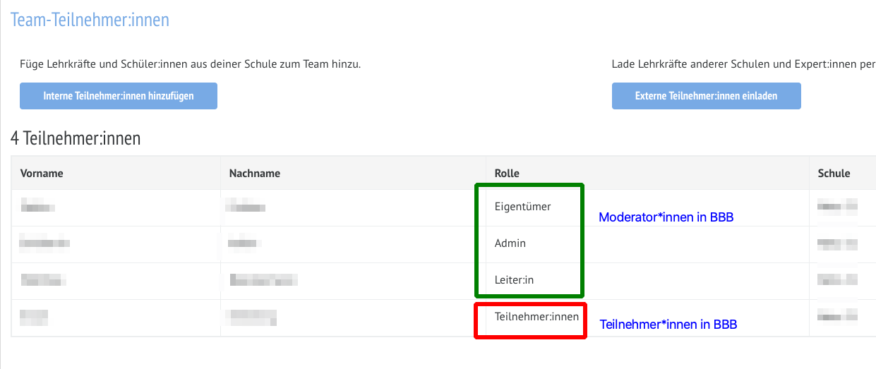 In BBB gibt es zwei Rollen: Teilnehmer*innen und Moderatoren. Moderatoren sind als Rechtecke, Teilnehmer*innen sind als Kreise dargestellt. Neben der Symbolik erkennen Sie sofort, welche "Rechte" den Teilnehmer*innen zugewiesen worden sind.