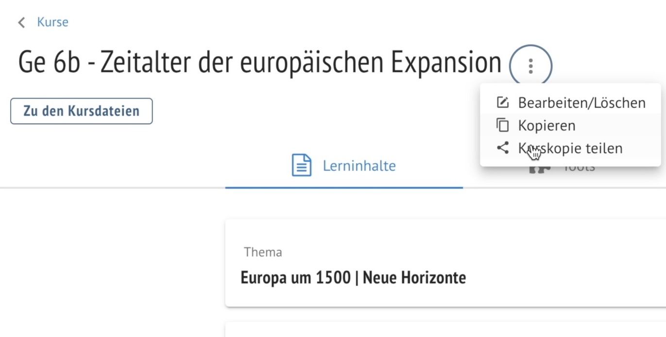 Nach der Erstellung eines Kurses (oder einer Vorlage) wird innerhalb des Kurses die Schaltfläche mit den drei Punkten neben dem Kursnamen angeklickt. Es öffnet sich ein Kontextmenü, in dem "Kurskopie teilen" angeklickt wird.