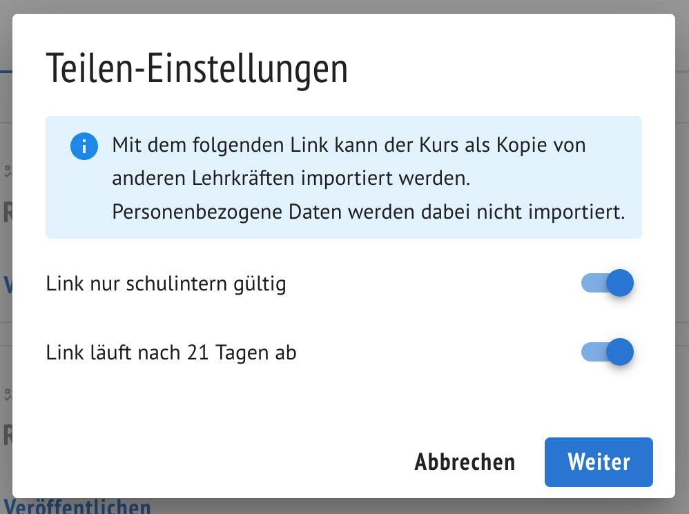 Es kann nun zwischen einer Begrenzung auf eine Kopie innerhalb der eigenen Schule und einer Kopie für andere niedersächsische Lehrkräfte ausgewählt werden. Zudem kann die Gültigkeitsdauer des Links begrenzt werden.