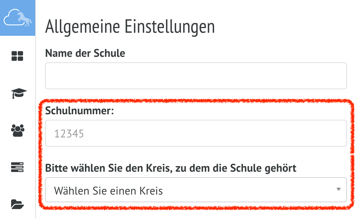 Tragen Sie dazu den (Land-)Kreis Ihrer Schule sowie gegebenenfalls die Schulnummer in der Verwaltung unter Schule verwalten ein. Diese Eingabe kann nur einmalig erfolgen und ist nicht veränderbar!