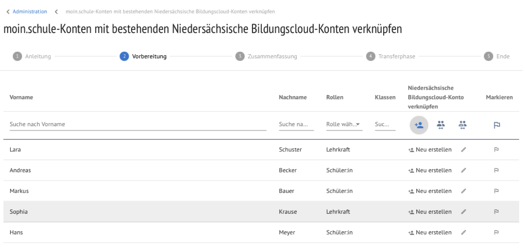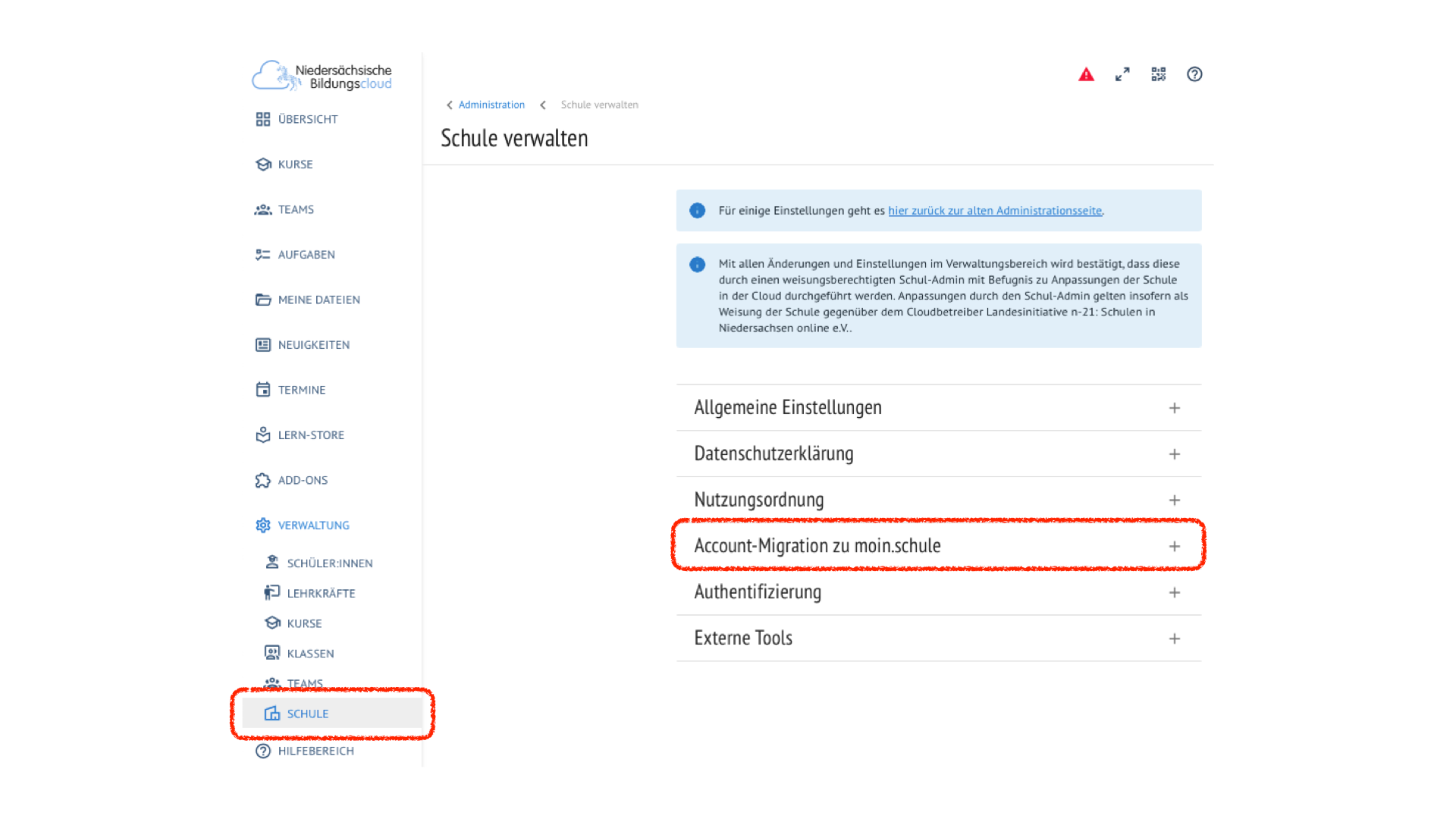 Vor dem Start des Migrationsassistenten muss mindestens ein Konto der Schule manuell migriert werden. So wird die Verbindung zwischen der NBC und moin.schule hergestellt.