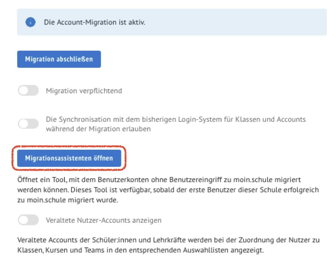 Entscheidende Voraussetzung für den Umzug ist, dass alle zu migrierenden Konten in moin.schule angelegt sind bevor der Migrationsassitent gestartet werden kann.