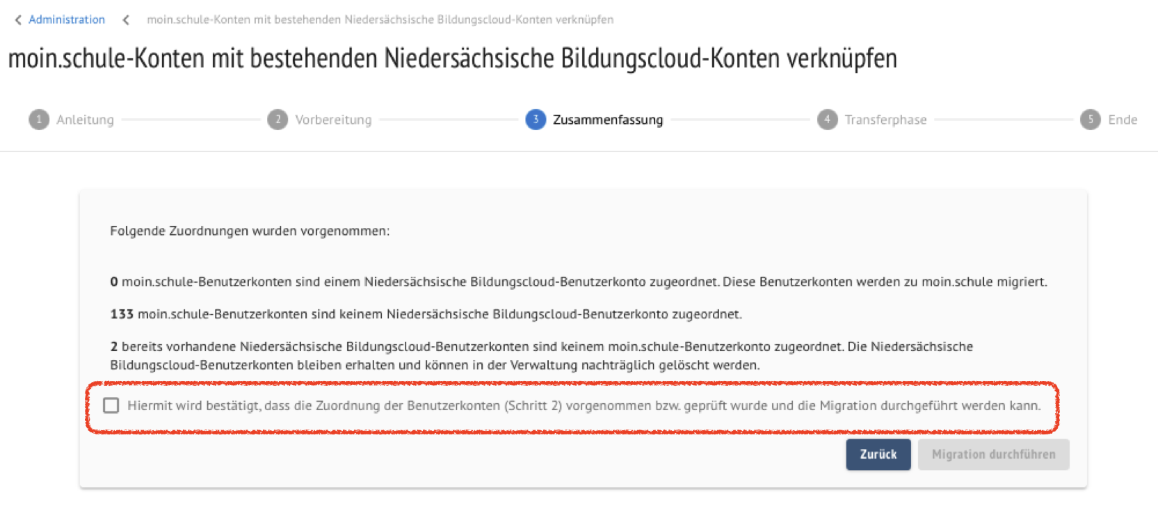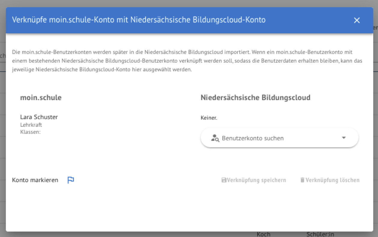 Der Migrationsprozess sollte im Hintergrund dennoch weiter ausgeführt und beendet werden, sofern der Browser nicht geschlossen wird. Die korrekte Verknüpfung der Benutzerkonten lässt sich in der Verwaltung innerhalb der Niedersächsischen Bildungscloud im Anschluss überprüfen.