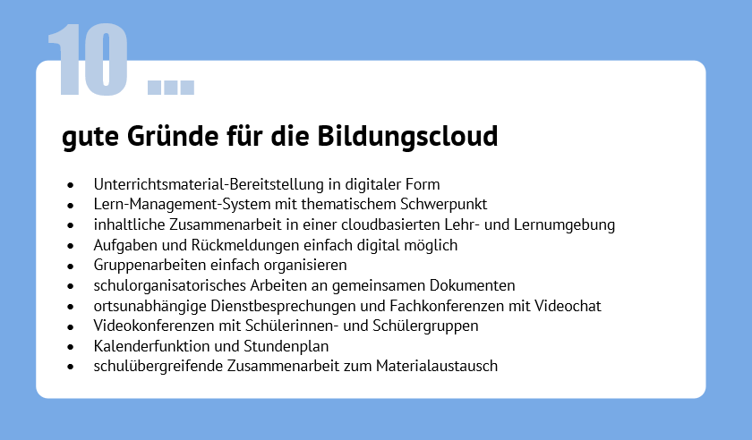 Die Bildungscloud ist ein vielseitiges Tool für den Unterricht. In Form von Kursen können unterschiedliche digitale Lernformen integriert werden. Individuell erstellte Kurse können auch über Schulgrenzen hinaus geteilt und angepasst werden. |