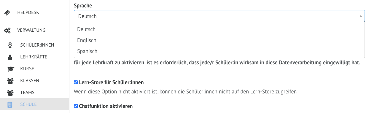 wollten Sie nicht schon immer einmal die sprachlichen Kompetenzen der Benutzer*innen in Ihrer Schule fördern? Sie können dieses sehr einfach erreichen, indem Sie in dem Bereich "Verwaltung - Schule" die Sprache der Bedieneroberfläche der NBC von Deutsch auf Englisch einstellen. Seit kurzer Zeit ist neben Englisch auch Spanisch hinzugekommen.