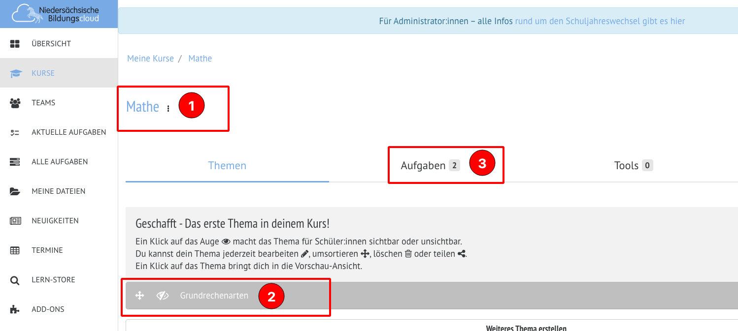 Das Thema muss natürlich durch "klick" auf das Auge (Pkt.2) sichtbar geschaltet werden, um die Aufgaben, obwohl sie schon mit dem Thema verknüpft sind, für Schüler*innen sichtbar zu machen.