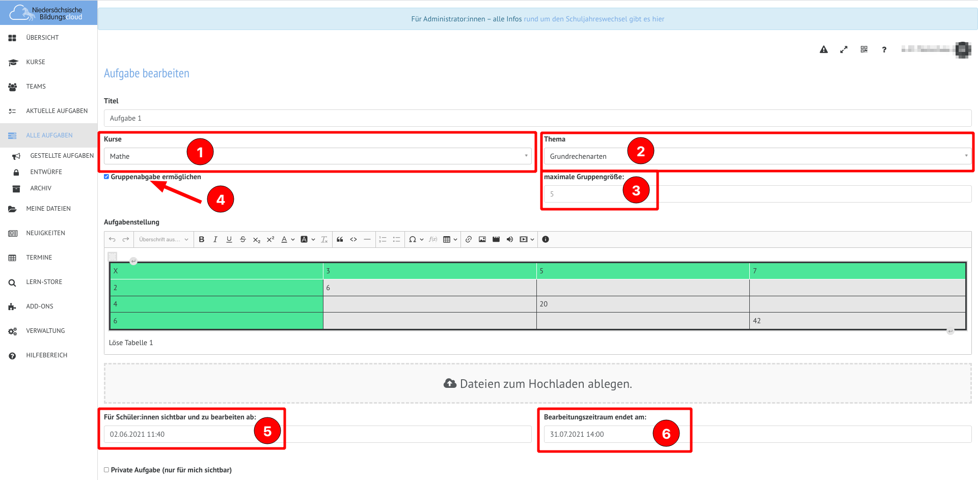 Auch die Bearbeitungszeit (Pkt.4,5) kann angegeben werden, muss aber nicht. Ist kein Bearbeitungszeitraum angegeben, bleiben die Aufgaben uneingeschränkt sichtbar.