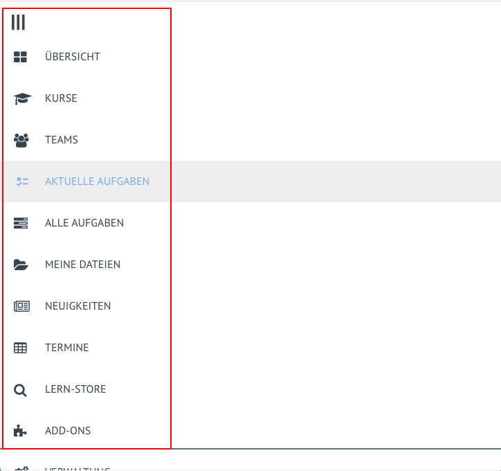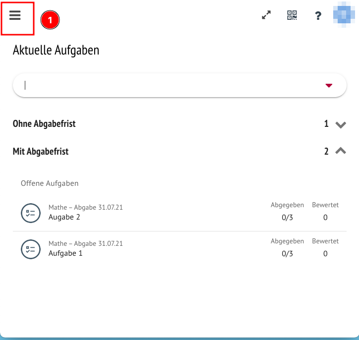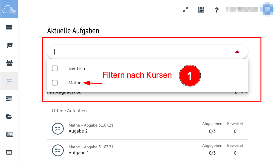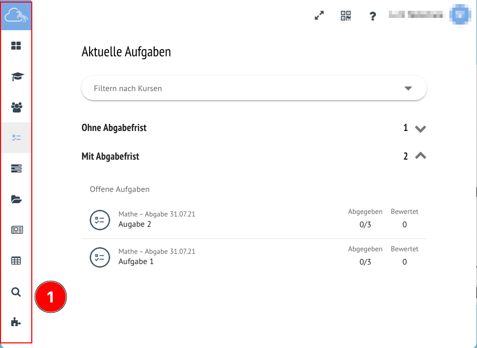 In der Seitenleiste befindet sich nun ein neuer Punkt (Pkt.1), der mit " Aktuelle Aufgaben" in der Lehrkraft-Ansicht und "Offene Aufgaben" in der Schüler*innen-Ansicht bezeichnet ist.