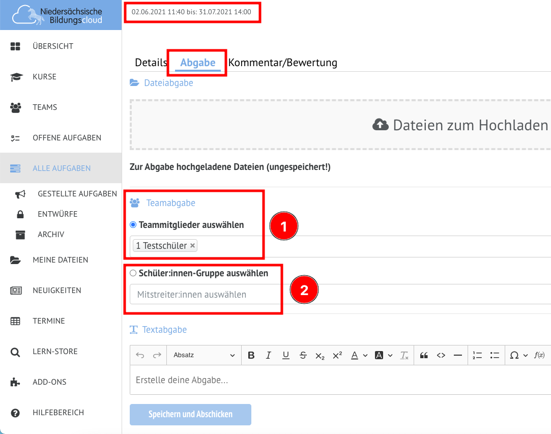 In diesem Bereich gibt es eine weitere Neuerung. Für den Fall, dass die Aufgaben für die Bearbeitung in Schüler*innen-Gruppen durch die Lehrkraft aktiviert wurde, können nun die Schüler*innen eigenständig weitere Mitstreiter bei der Abgabe hinzufügen.