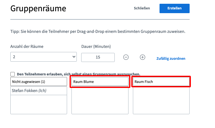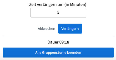 Die Gruppen-Räumen können nun eigene Namen erhalten und die Arbeitszeit in den Gruppenräumen kann während der Laufzeit verlängert werden, um gezielt Schülerinnen und Schülern in Teilarbeitsgruppen mehr Zeit einzuräumen.