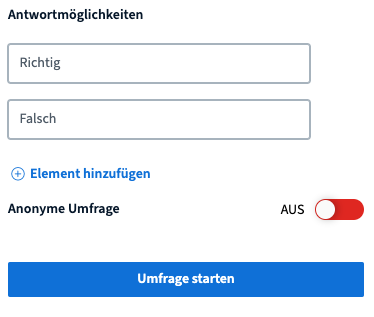 Auf die Anonymität wird bei der Durchführung der Umfrage auch vom System hingewiesen. Hier können Lehrkräfte ihren Schülerinnen und Schülern zusätzliche Offenheit bei der Beantwortung von Fragen erlauben.