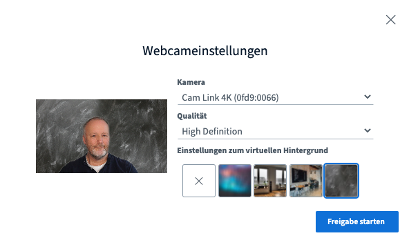Standardmäßig wird für eine freigegebene Webcam die niedrigste Übertragungsqualität voreingestellt. Diese Einstellung ist gerade für mobile Nutzende mit langsamer Internetverbindung sinnvoll, geht aber einher mit schlechterer Übertragung einher. Bitte wählen Sie für eine BESSERE Qualität mindestens die Stufe "Mittlere" Qualität aus.