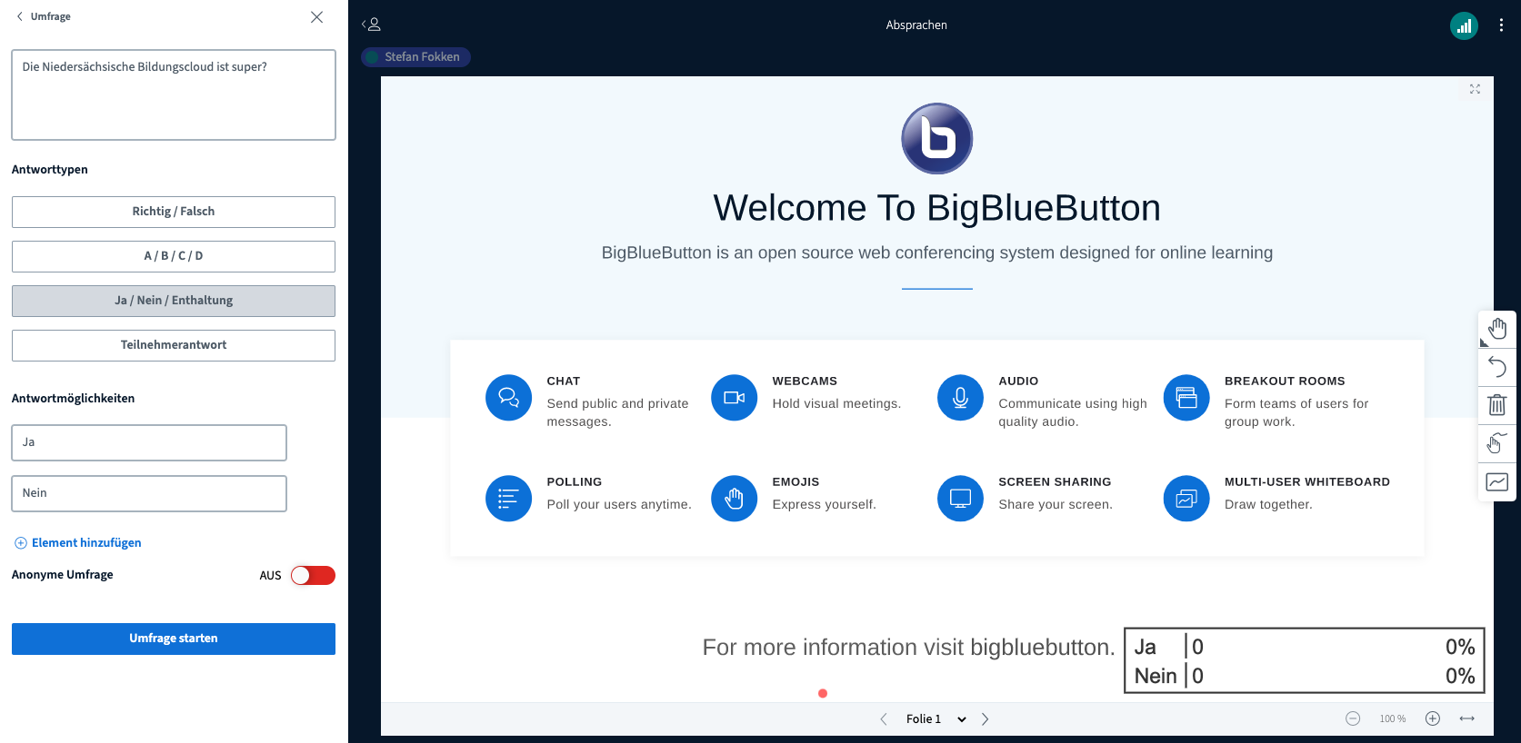 Zum Begin der zweiten Schuljahreshälfte ist das aktuellste Release 2.4 von BigBlueButton in der Niedersächsischen Bildungscloud (NBC) eingebunden worden. Durch den modularen Aufbau der NBC sind diese Aktualisierungen von Teilfunktionen einfach zu realisieren.