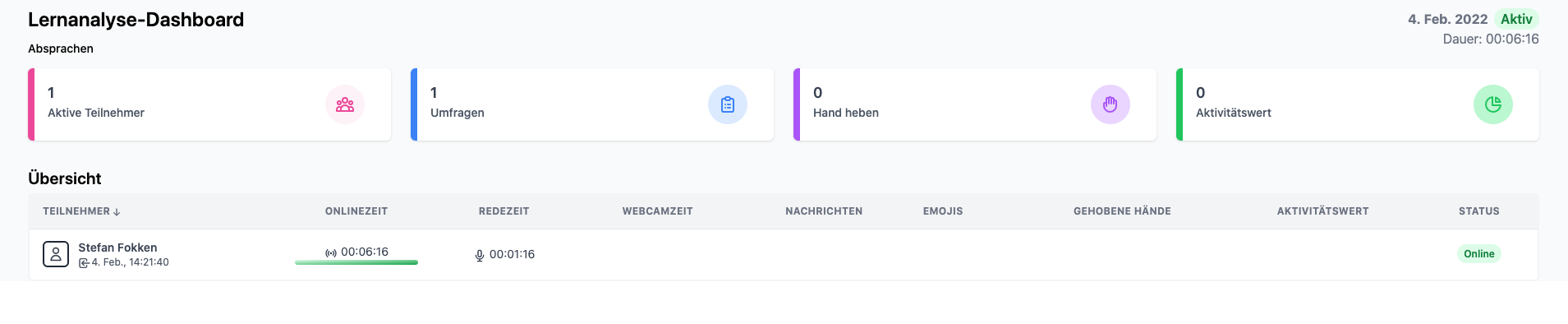 Mit dem Lernanalyse-Dashboard erhalten Sie ein Werkzeug, das Ihnen erlaubt, schnell einen Überblick über die Anwesenheit und die Beteiligung der Lernenden in Ihrer Videokonferenz zu erhalten.