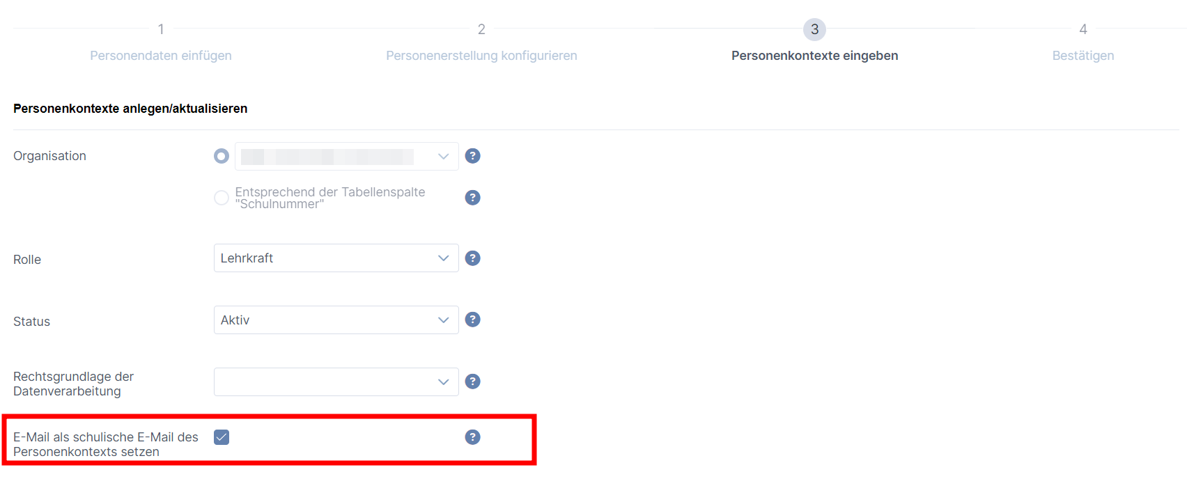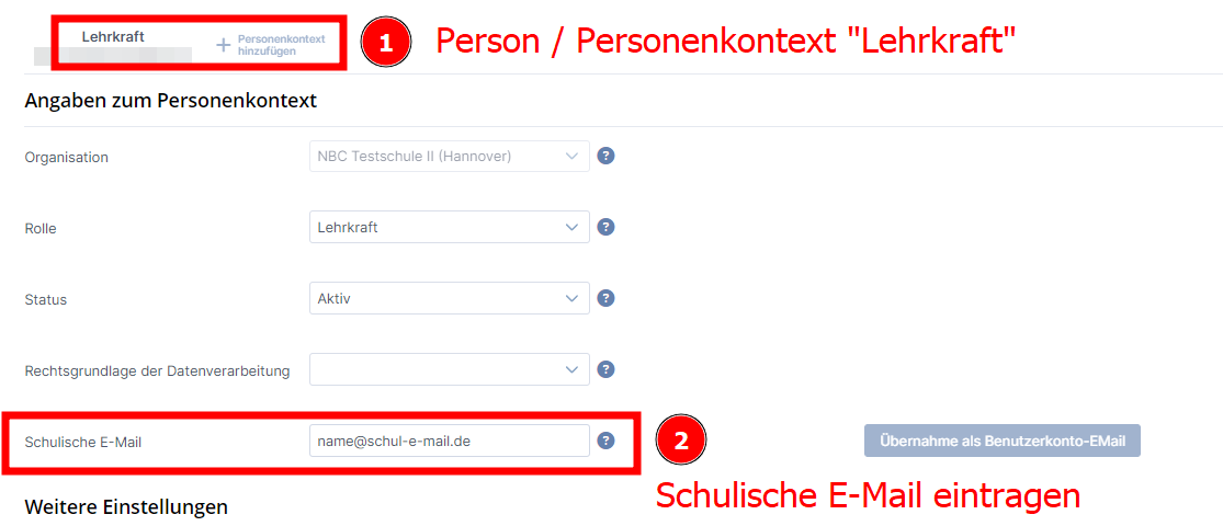 Dazu wird dem Personenkontext der Lehrkraft eine "Schulische E-Mail" zugeordnet.