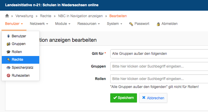 Sorgfältig vergebene Rollen in Ihrer Benutzerverwaltung erleichtern Ihnen den Start! Für die Nutzung der Niedersächsischen Bildungscloud müssen Ihre Lehrkräfte die IServ-Rolle "Lehrer" vergeben haben. Die Rolle ist Bestandteil des IServ-Pakets "Schulserver" und wird bei der Installation des Pakets automatisch angelegt. Sie können die Rollen in der Benutzerverwaltung Ihres schuleigenen IServ verwalten.