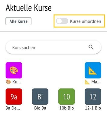 Auf Mobilgeräten befindet sich rechts oben die Schaltfläche Kurse umordnen, die sich ein- und ausschalten lässt. Anschließend können die Kurs-Symbole dann frei bewegt werden.