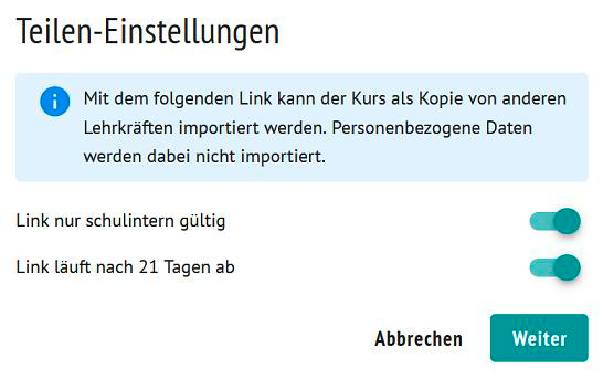 Im nun folgenden Fenster kann der Link zum Teilen des Kurses weiter angepasst werden. Hier kann eingestellt werden, dass der Link nur schulintern gültig sein soll oder auch eine zeitliche Gültigkeit für den Link gewünscht ist: