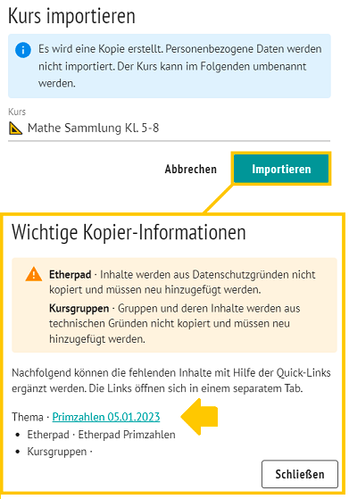 Wie bereits im Hinweisfenster erwähnt, erfolgt durch den Import eine Kopie des derzeit aktuellen Kurses. Alle personenbezogenen Daten, auch innerhalb der verwendeten Aufgaben und Tools, werden entfernt. Das nachfolgende Fenster zeigt dann das Kopierergebnis, wo dann außerdem auf entfernte Inhalte hingewiesen wird, die ggf. mit Klick auf die entsprechenden Abschnitte ausgetauscht werden können.