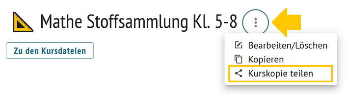 Damit die viele Arbeit, die in die Kurse fließt, auch im Kollegium Verbreitung finden kann, können Kurse nun ganz einfach über einen Link mit anderen geteilt werden. Im Kontextmenü eines Kurses ist jetzt die Teilen-Funktion auffindbar: