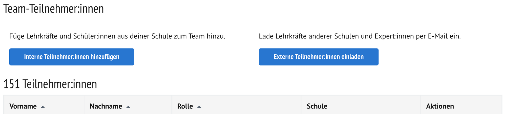 Die Ansicht der Team-Teilnehmenden lässt sich nun nach den Namen und Rollen sortieren. Laden Sie weitere Teilnehmende ihrer eigenen Schule mit "Interne Teilnehmer:innen hinzufügen" und Lehrkräfte anderer Schulen gerne als "Externe Teilnehmer:innen" ein. Nicht schulische Personen können als "Externe Expert:innen" mit stark eingeschränkten Berechtigungen in ein Team eingeladen werden.