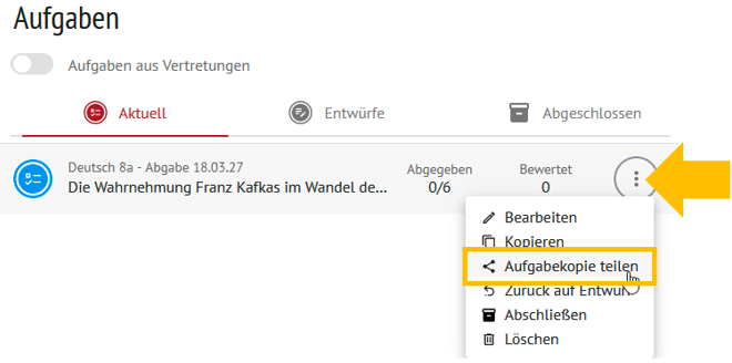 Die Funktion des Teilens von Unterrichtselementen in der Niedersächsischen Bildungscloud (NBC) wird durch das Teilen von Aufgaben erweitert. Im Kontextmenü eines Themas ist nun die Teilen-Funktion zu finden.