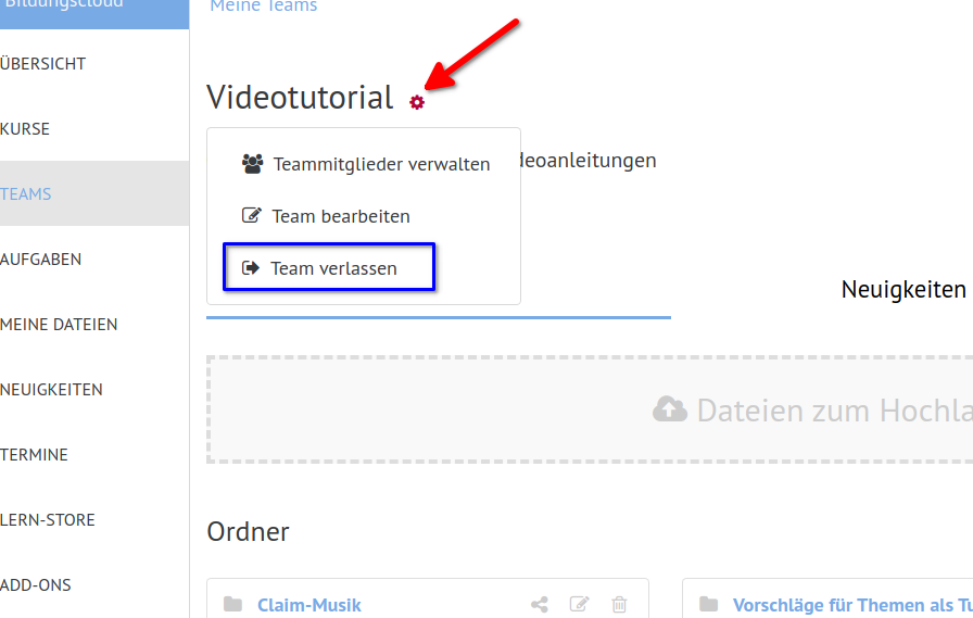 Sie können übrigens ein Team, zu dem Sie hinzugefügt wurden, jederzeit wieder verlassen. Klicken Sie auf das Zahnrädchen neben dem Teamnamen zum Bearbeiten und wählen Team verlassen: