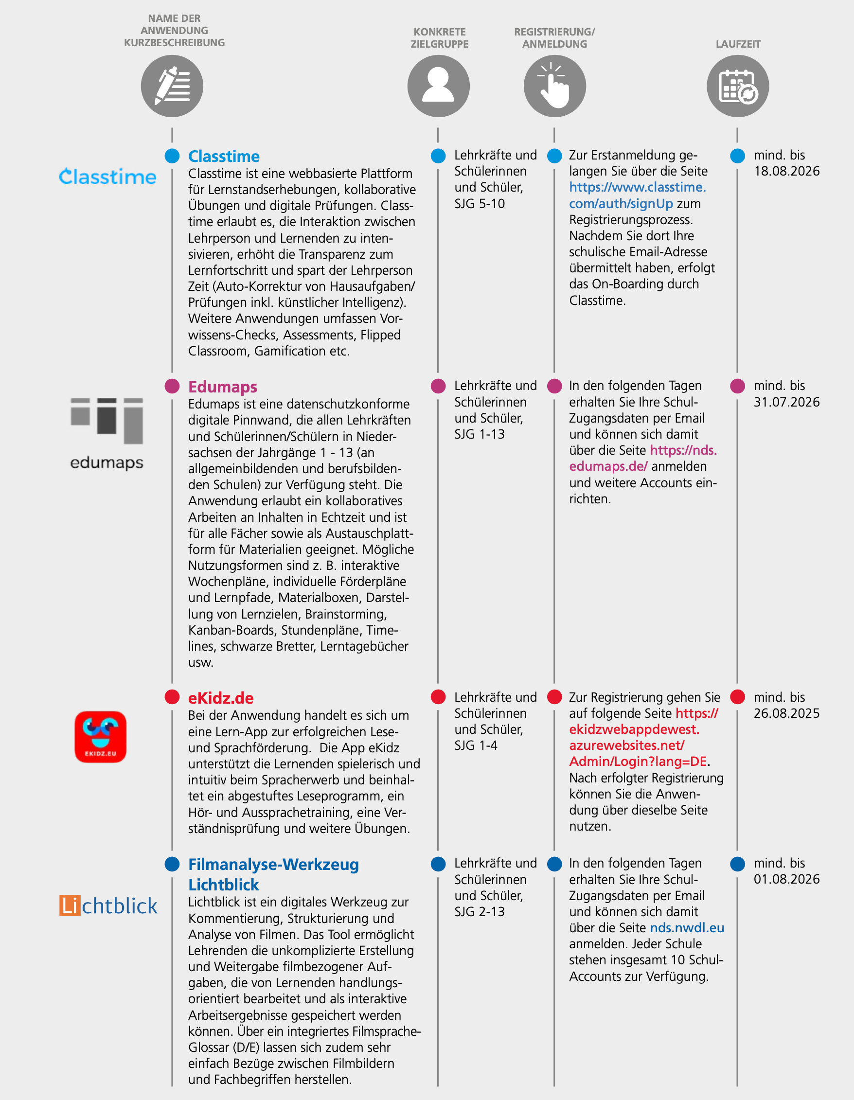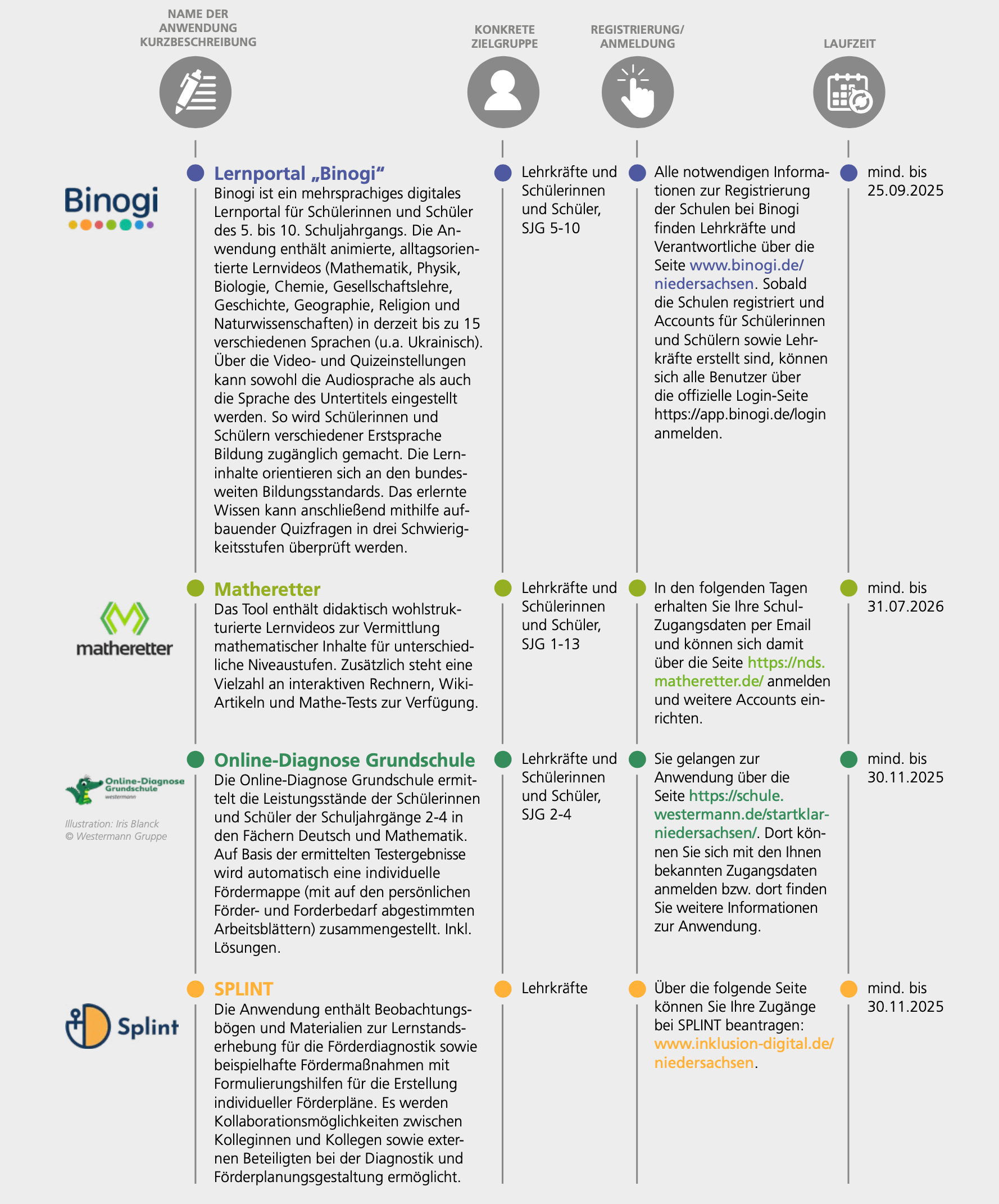 Die Programme mit unterschiedlichen Laufzeiten werden den Schulen zur Nutzung angeboten. Diese bieten Schülerinnen und Schülern die Möglichkeit, Aufgaben und Übungseinheiten selbstorganisiert zu bearbeiten und helfen Lehrkräften bei der Unterrichtsplanung.